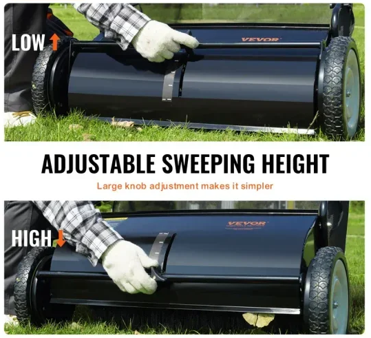 Heavy-Duty Construction:Β Our hand push lawn sweeper is built to last with reinforced steel pipes, providing a stable and sturdy frame that won't tip over even when the hopper bag is full. Plus, we've added a height scale guide next to the knob for easy adjustment before cleaning.